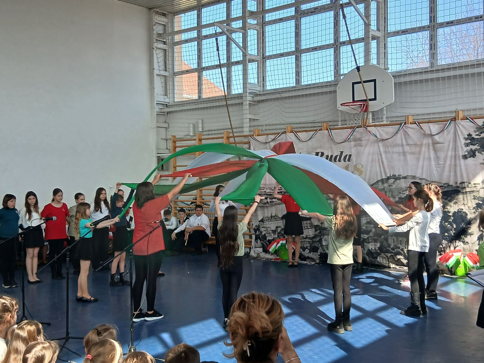 A prózai és verses jeleneteket látványos táncos elemek gazdagították: az 5.a és 5.b osztály lányai zászlós tánccal jelenítették meg a nemzeti színek hangulatát, míg a fiúk lendületes tánca