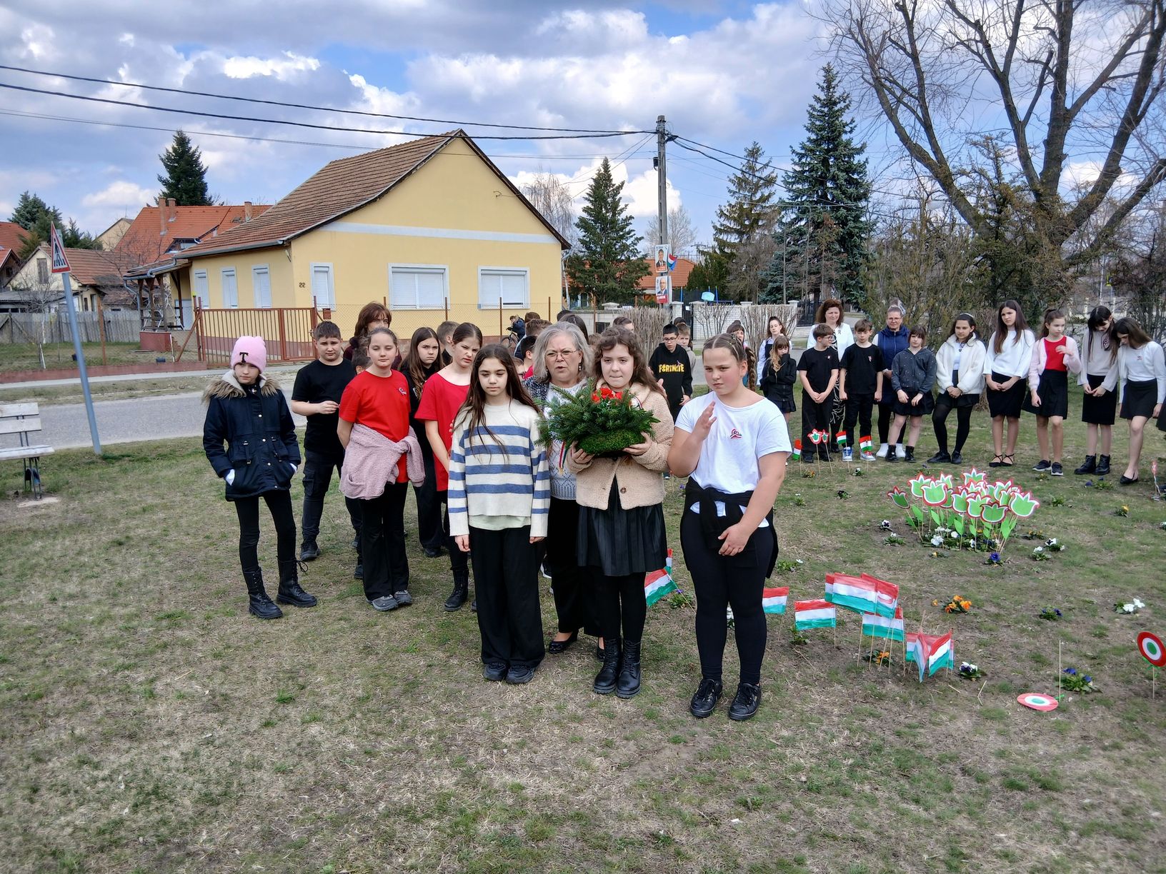 Az iskolai ünnepséget követően a műsorban szereplő tanulók és felkészítő pedagógusaik, az iskola vezetése, valamint a diákönkormányzat képviselői közösen koszorút helyeztek el a Petőfi téren található emlékhelynél, ezzel is tisztelegve a forradalom és szabadságharc hősei előtt.
